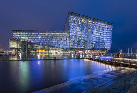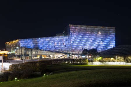 Reykjavik Iceland - October 26. 2018: Concert hal Harpa in the evening with blue light