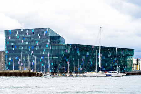 Reykjavik, Iceland - 11 May, 2013: Hapra Concert, a landmark of the city with glass windows, on the waterfront of central Reykjavik