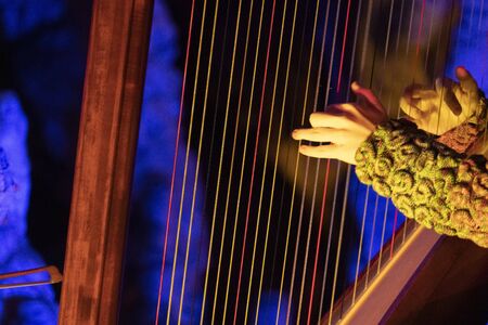 Harp strings closeup hands. Harpist with Classical Music Instrument