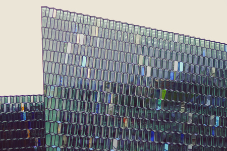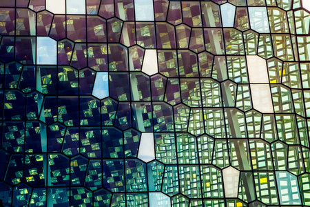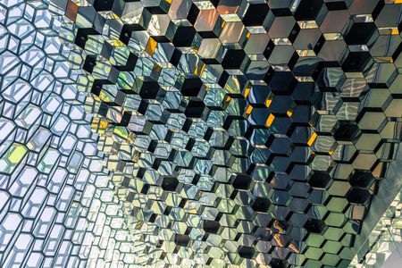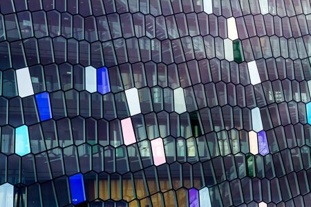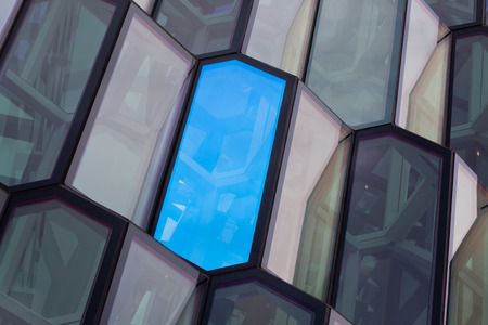 A distinctive colored glass facade inspired by the basalt landscape of Iceland at Harpa concert hall and opera house in Reykjavik, Iceland.