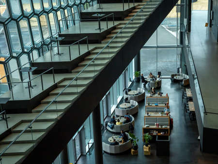 Reykjavik, Iceland - March 23, 2022: People sitting in the restaurant inside Harpa concert hall. Modern architecture, colorful glass walls.