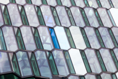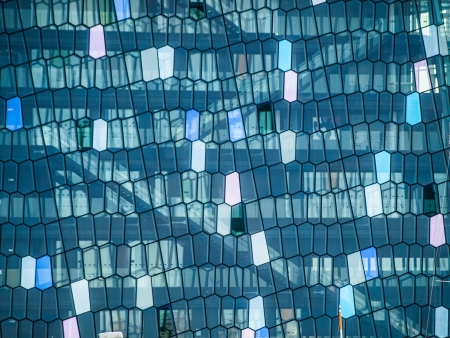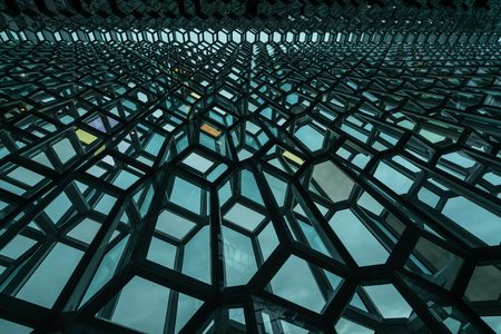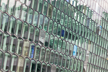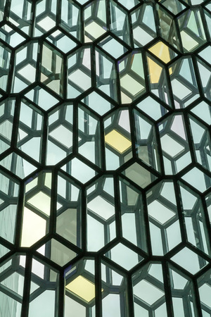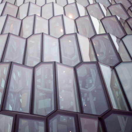 Detail of the glass facade of the Harpa Concert Hall in Reykjavik, Iceland.
