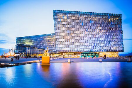 ReykjavÃk, Iceland, February 2017 : Harpa Concert Hall view during blue hour which is a concert hall and conference centre