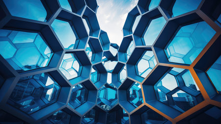 Office buildings. Structure of hexagon windows in futuristic technology network connection concept. Blue glass modern architecture facade design with reflection of sky in urban city, Downtown.