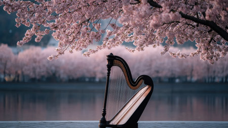 A peaceful image of a harp resting under a cherry blossom tree in full bloom