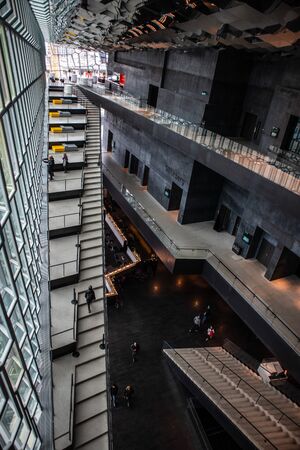 Harpan music hall building interior photo. Beautiful urban architectural photography with glass wall on background. High quality picture for wallpaper, travel blog, magazine, article