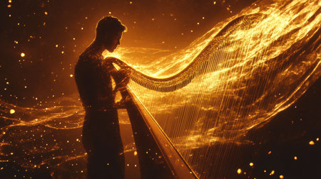 A man stands immersed in radiant golden light while playing a harp.