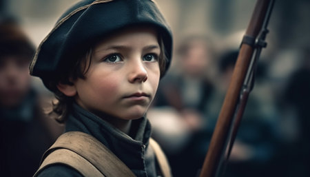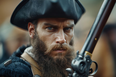 Close-Up Portrait of a Serious Revolutionary War Soldier in Tricorn Hat Holding Musket