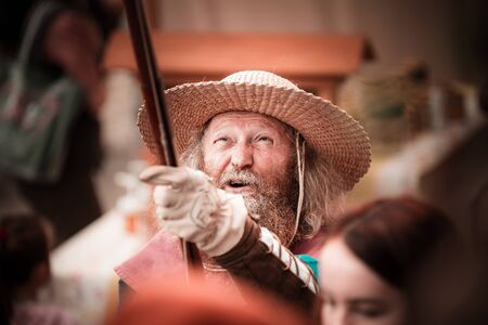 Taggia, Italy - March 17, 2018: Participant of medieval costume party in the historic city of Taggia in Liguria region of Italy. The actors acting out episodes of daily life The episodes depicted are inspired by true events, drawn from documents