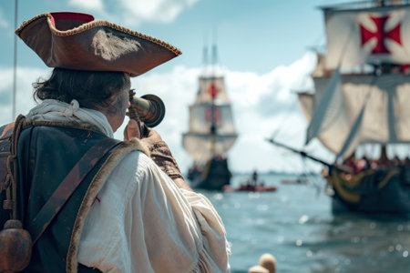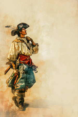 Portrait of a medieval pirate in captain hat on ship. Sea Robber