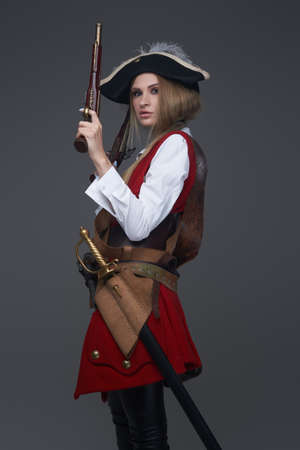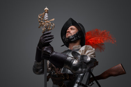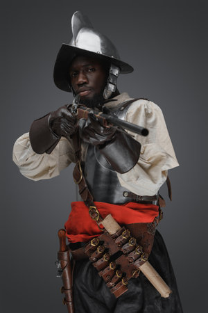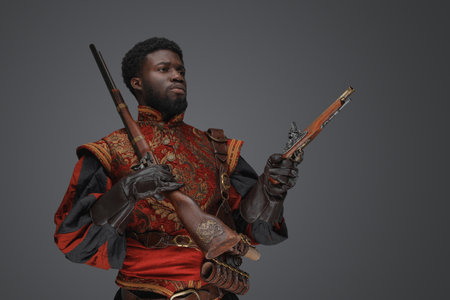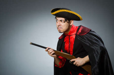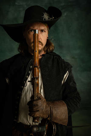 Cropped portrait of brutal frightening man, medeival pirate in vintage costume with sword and gun isolated over dark background.