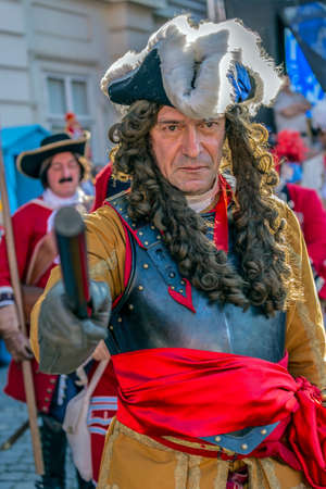 TIMISOARA, ROMANIA-MAY 12,2018:Medieval military commander marching on the street. Show organized by City Hall Timisoara to celebrate the 300 years since the entry of Eugene of Savoy into the fortress