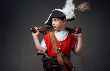 Cropped image of vintage pirate costume with pistol, gun isolated over dark background