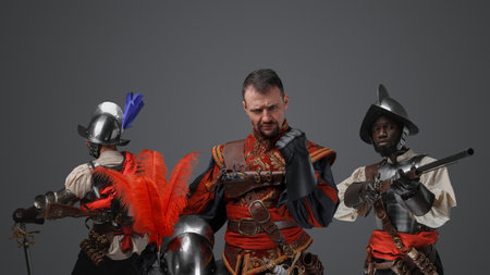 Three historical reenactors, dressed in traditional 17th-century garments, strike confident poses with muskets, embodying a bygone era.