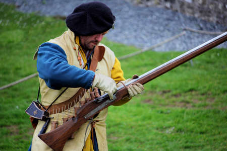Falmouth, Cornwall, UK - April 12 2018: Historical military re-enactor dressed in bleu and yellow Tudor clothes with leather equipment loading a working musket.