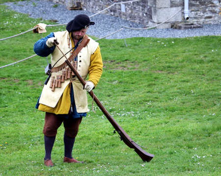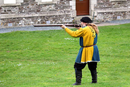Falmouth, Cornwall, UK - April 12 2018: Historical military re-enactor dressed in bleu and yellow Tudor clothes with leather equipment demonstrating a working musket.