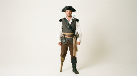 A serious man dressed as a historical pirate captain with a tricorn hat, vest, and a wooden peg leg. He stands confidently in a studio with a plain background.