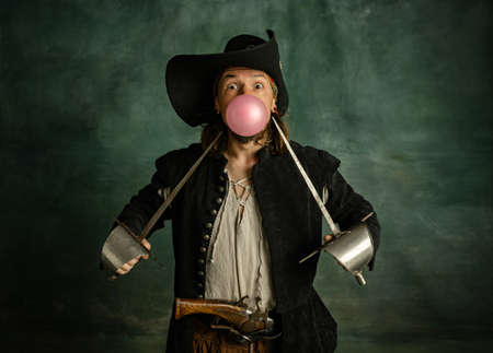 Portrait of one brutal man, medeival pirate crossing swords and inflating gum isolated over dark background.