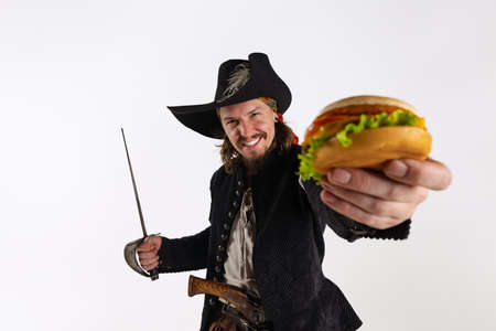 Cropped portrait of brutal man, pirate in vintage costume with sword proposing burger isolated over white background