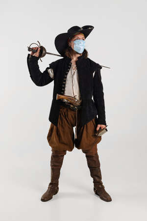 Full-length portrait of man, medeival pirate in vintage cloth with sword wearing protection mask isolated over white background