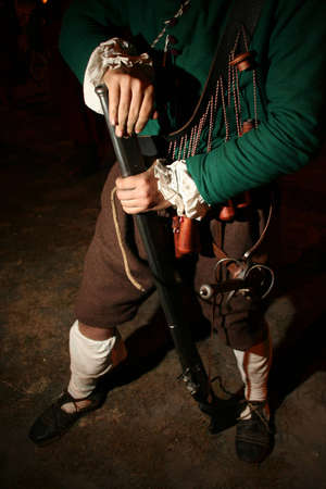 ALCALA DE HENARES, MADRID, SPAIN - OCTOBER 12, 2021: man disguised as a soldier of the spanish thirds pointing his musket during the celebration of a medieval festival in alcala de henares