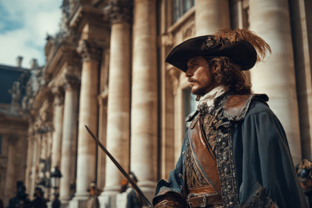 Guarding the grand palace entrance, a musketeer stands poised with sword in hand. His attentive gaze reflects the duty of protecting this majestic site in brilliant detail.