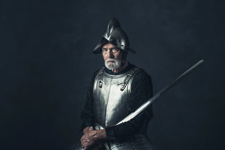 Portrait of a medieval senior warrior man in armor after a battle with dirty and blood-smeared face.