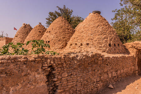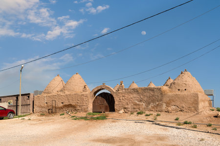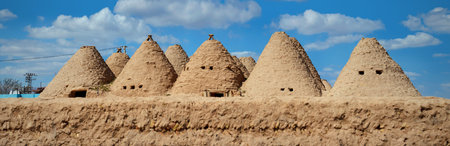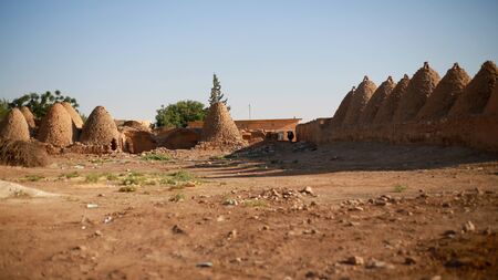 In a hot day, mudbrick house in the Harran village, Traditional mud brick beehive houses with cone-shaped roofs, Sanliurfa, Turkey