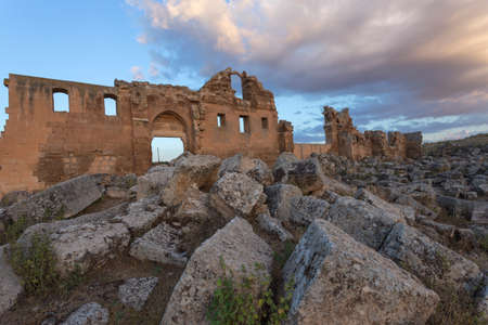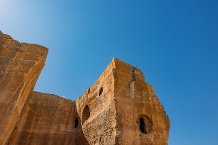 Carved stone buildings of ancient city of Dara at daytime. Visit Mardin background photo.