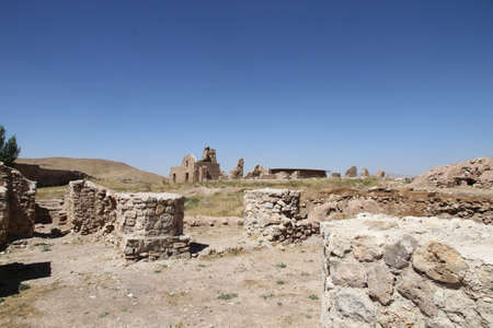 Aerial zoom in view Ani wall ruins in Turkey, Kars. Archeological site of medieval armenian city