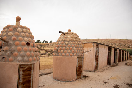 Rustic bee hives made of mud, in modern days it is supported with cement for birds to live in with wheat field in the background And houses for domesticating animals, such as sheep, chickens, and cows
