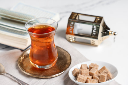 Glass of tasty Turkish tea with fanoos and sugar on white marble background. Ramadan celebration