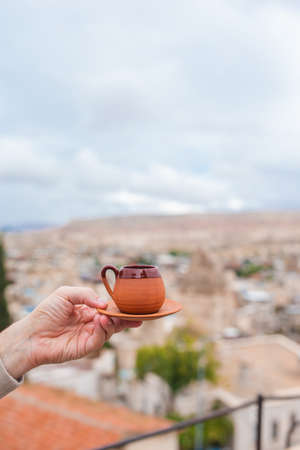 Cup with traditional Turkish coffee on a background of a valley in Cappadocia, Turkey.