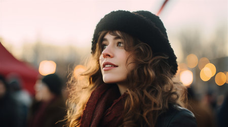 Generative AI, Beautiful young woman in the Christmas fair, blurred background, winter street market in Europe.