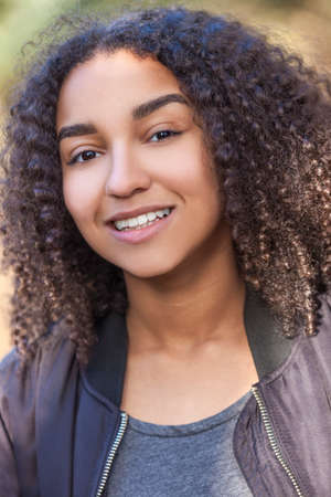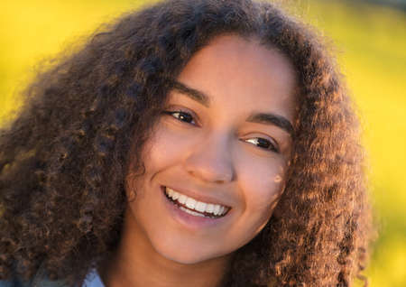 Outdoor portrait of beautiful happy mixed race African American girl teenager female young woman smiling with perfect teeth