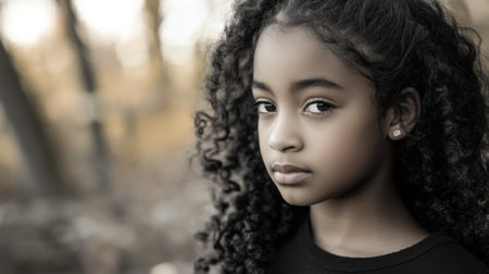 A young girl with beautiful curly hair stares pensively in an autumn forest surrounded by trees and soft muted colors of fall.
