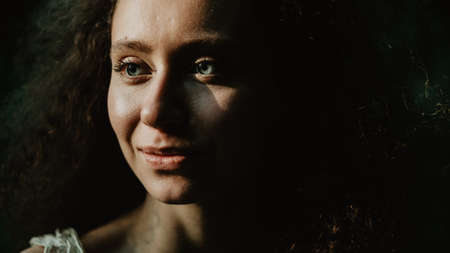 Portrait of a young woman with curly hair in a dark room