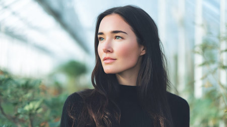 A young woman with long dark hair and green eyes looks off to the side, with a soft focus background of greenery and a glass structure.