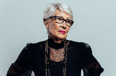 image of a beautiful and elegant old influencer woman. Cool grandmother posing in studio wearing fashionable clothes