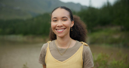 Nature, smile and face of young woman on a vacation, weekend trip or adventure in a forest. Happy, travel and portrait of African female person with positive and good attitude for outdoor adventure.