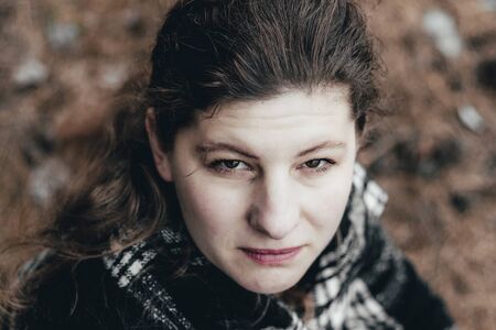 Closeup portrait of young white Caucasian woman girl looking directly in camera with messy hair on windy summer autumn fall day outdoor, old vintage retro film effect, hipster style