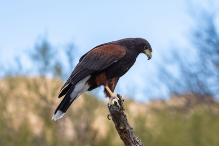 A dark brown Harris Hawk in Tucson, Arizona