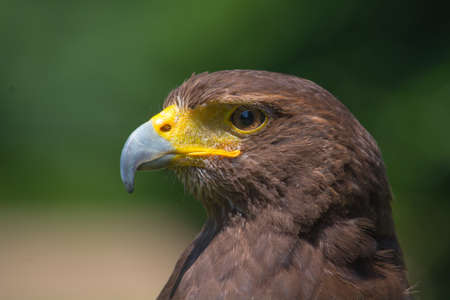 Profile portrait of a brown eagle with yellow beak in the forest