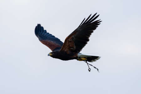 Harris's hawk (Parabuteo unicinctus), flying through air formerly known as the bay-winged hawk or dusky hawk from South America in conservation center