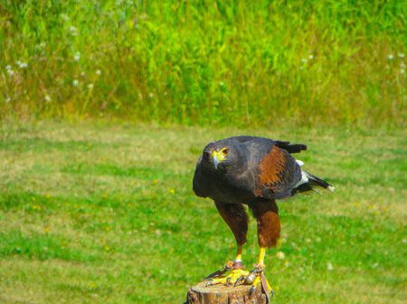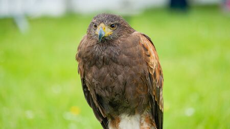Harris haw walking on the grass. Trained bird watcher concept. Predator birds.