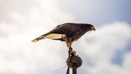 Falconry. Haris hawk bird of prey on display with copy space.