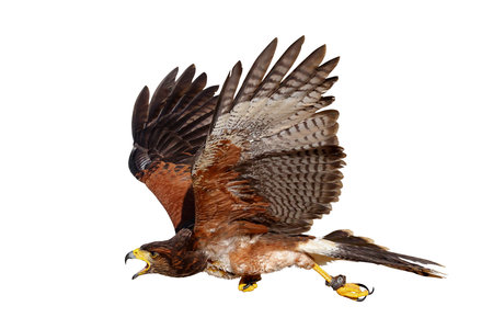 Beautiful flying Harris's hawk isolated on white background with clipping path.