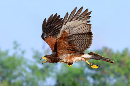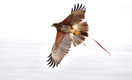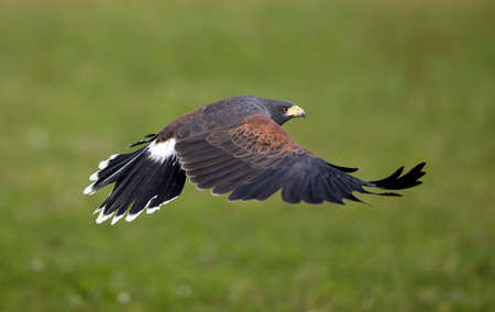 A captive harris hawk, used in falconry, taken out by his falconer for a training flight. Its wings spread, showing the details of feathers and claws