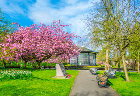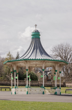 Newcastle, UK - Apr 13, 2025 - View of A Bandstand And A Grandstand. It’s a modern replica of the Victorian bandstand that had been installed in the Leazes park. The Music Pavilion with Green trees in the background, use it as your Wallpaper, Poster and Space for text, Selective focus.