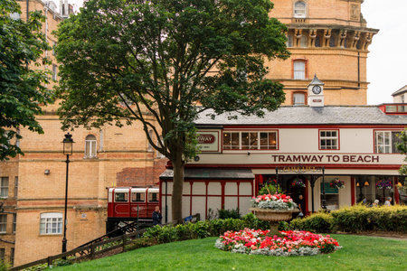 SCARBOROUGH, UK - August 13, 2018: Original historic tramway running in the centre of Scarborough taking passengers to and from the South Beach.